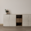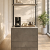 .تصميم عملي يحتوي على أدراج للتخزين، رف علوي للديكور، وسطح مناسب لماكينة القهوة