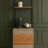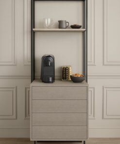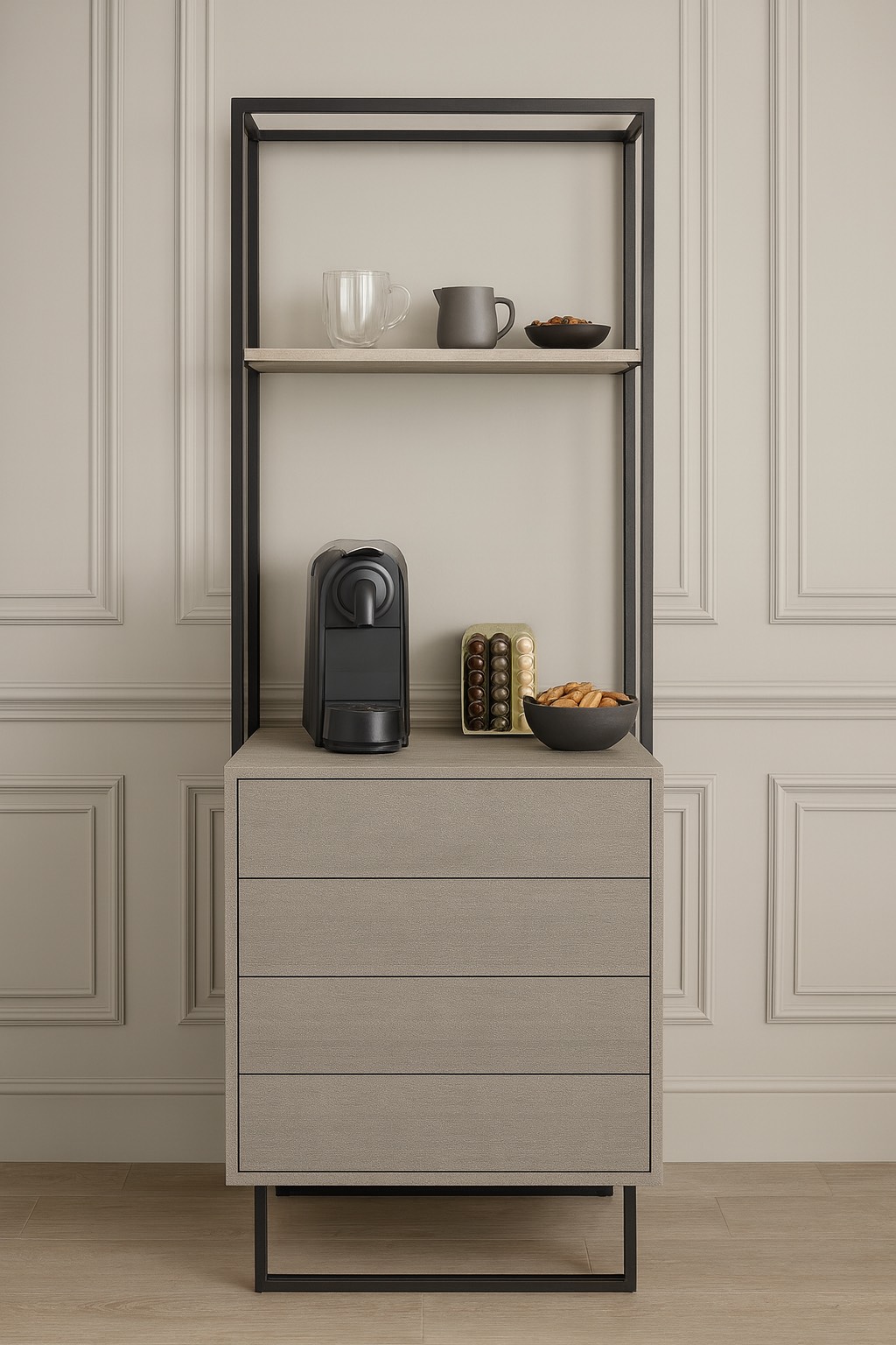 يحيط به هيكل معدني أسود يمتد بارتفاع كامل (200 سم)، مما يمنحه حضوراً قوياً واستغلالاً مثالياً للمساحة العمودية. توفر الوحدة أربعة أدراج واسعة بواجهة ملساء (بدون مقابض) للحفاظ على الانسيابية البصرية، وتخزين كميات كبيرة من الكبسولات والمستلزمات، بينما يمنحك الرف العلوي منصة مثالية لعرض الأكواب الزجاجية أو الديكورات المعدنية.