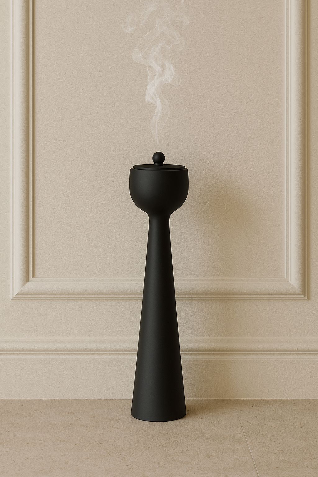 Masterfully made from natural wood and finished in a sophisticated matte black, the burner features a dramatic, sculptural design that combines strength with flowing lines. Its role extends beyond being a functional burner for scenting your home with refinement; it is also a standalone decorative object that expresses exquisite taste and adds an atmosphere of modern elegance to any corner.