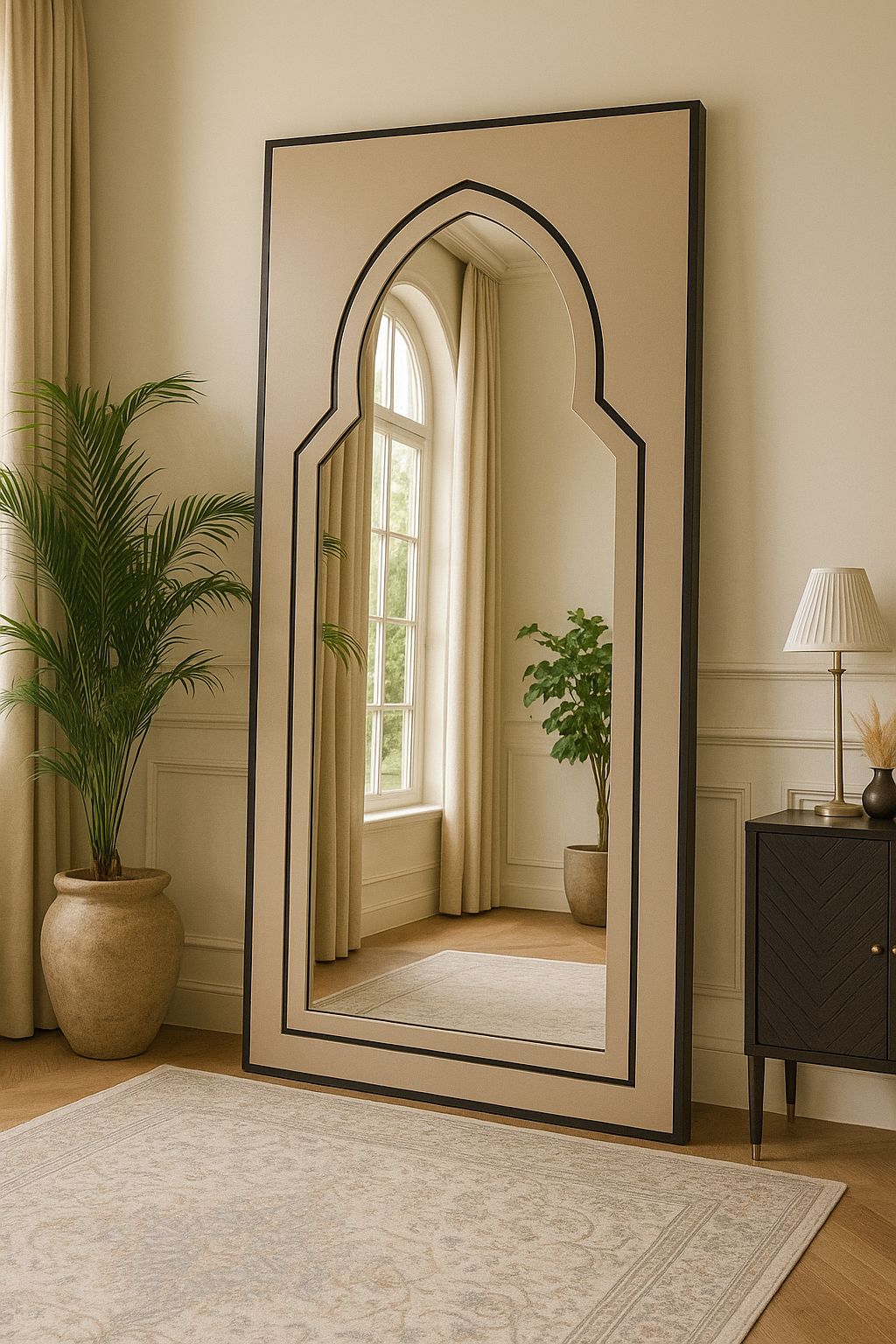أضف لمسة من الأناقة الخالدة إلى منزلك مع هذه المرآة الطولية الساحرة. تتميز بإطار عريض ذي مظهر رخامي أبيض مع عروق طبيعية هادئة، محاط بحواف معدنية ناعمة بلون ذهبي فاتح تضفي عليه لمسة نهائية من الرقي. تصميمها الفاخر يجعلها قطعة مركزية مثالية في أي مساحة، حيث تعكس الضوء وتمنح شعوراً بالاتساع، مما يجعلها إضافة مثالية لغرفة النوم، المدخل، أو غرفة المعيشة ذات الطابع الكلاسيكي أو المودرن.