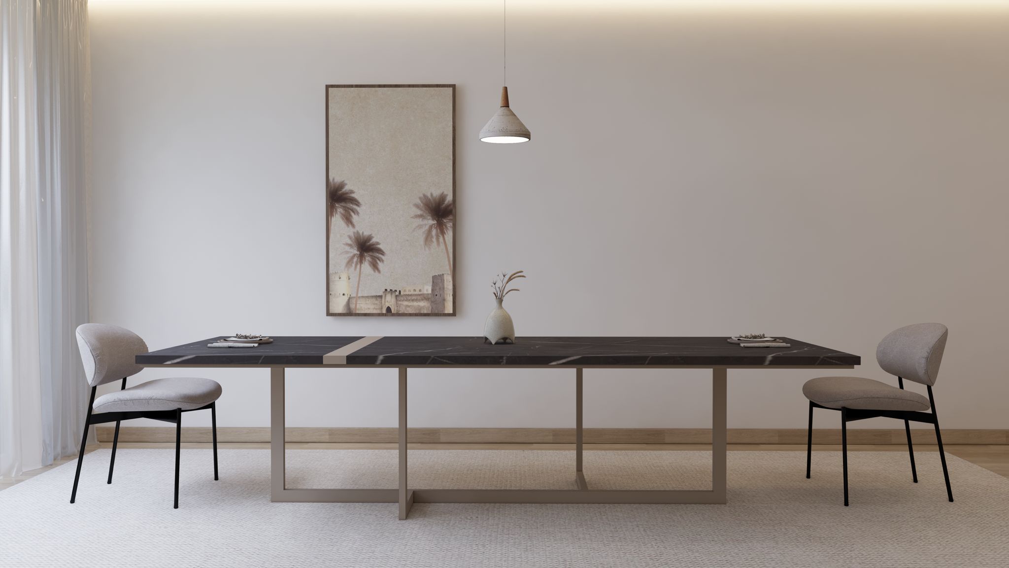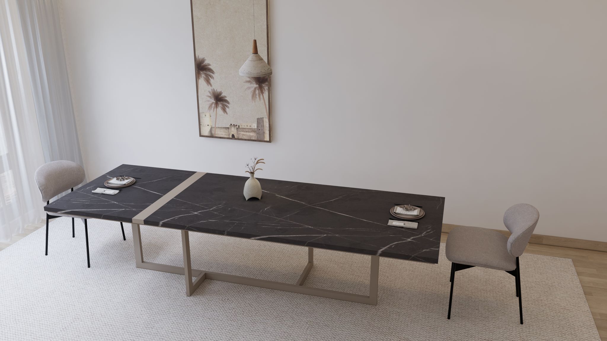 طاولة عصرية بتصميم أنيق يوازن بين الفخامة والبساطة، سطحها من خشب أوروبي عالي الجودة بتاثير الرخام مقاوم للماء والخدش ليضمن تحمّل الاستخدام اليومي مع الحفاظ على جماله. ترتكز على قاعدة معدنية مطلية بالصبغ بتصميم هندسي ثابت يمنحها متانة ولمسة حديثة، لتكون قطعة مثالية لغرف الطعام الراقية والمساحات المعاصرة