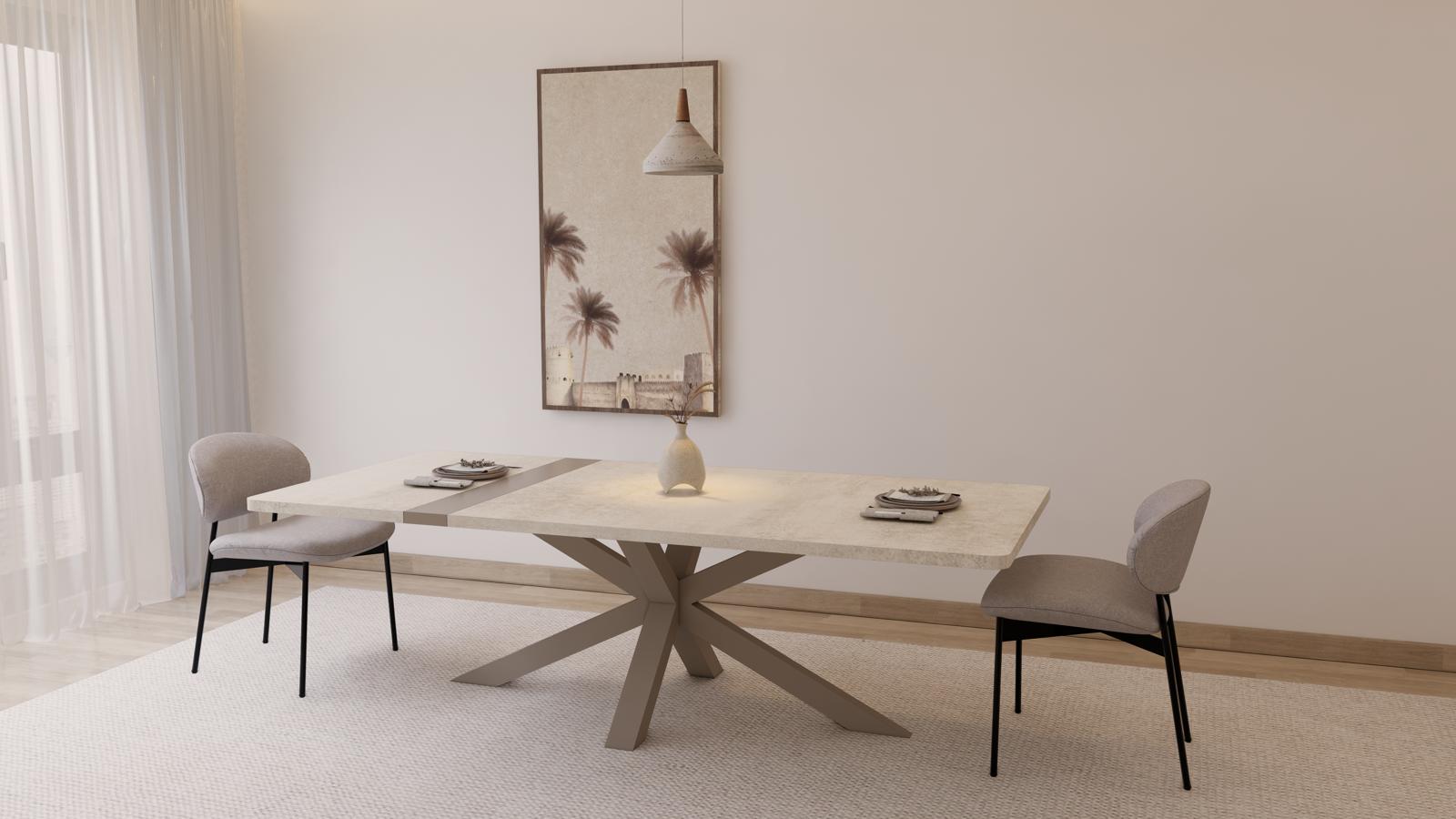 طاولة عصرية بتصميم أنيق يوازن بين الفخامة والبساطة، سطحها من خشب أوروبي عالي الجودة بتاثير الرخام مقاوم للماء والخدش ليضمن تحمّل الاستخدام اليومي مع الحفاظ على جماله. ترتكز على قاعدة معدنية مطلية بالصبغ بتصميم هندسي ثابت يمنحها متانة ولمسة حديثة، لتكون قطعة مثالية لغرف الطعام الراقية والمساحات المعاصرة