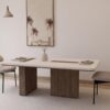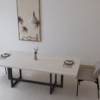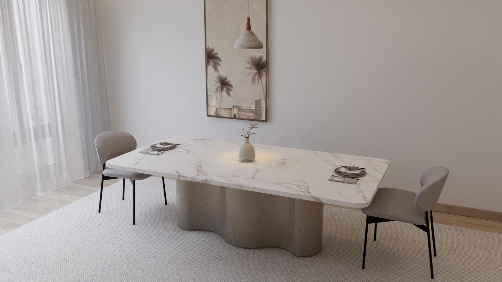 طاولة طعام بتصميم معاصر تستوعب حتى 8 شخص، تجمع بين الفخامة والبساطة في تفاصيلها. تتميز بقاعدة منحنية بملمس وتأثير معدني يمنحها حضوراً بصرياً قوياً وثباتاً عالياً، مع سطح من الخشب الألماني عالي الجودة بتاثير الرخام يناسب مختلف أنماط الديكور الحديثة الخامات المختارة تعكس توازناً بين المتانة والجمال، لتكون الطاولة قطعة مركزية في مساحة الطعام، مناسبة للاستخدام اليومي والاستضافة الرسمية في آنٍ واحد .